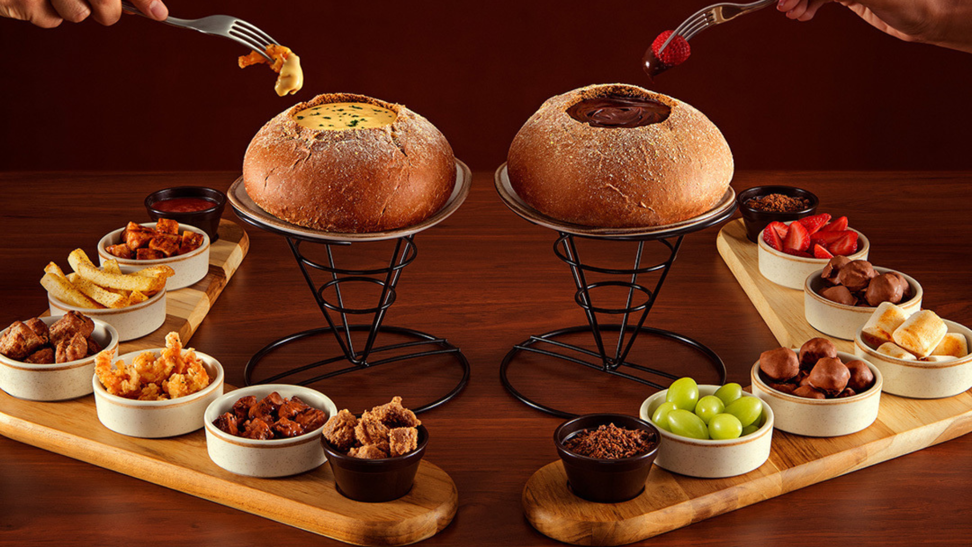 Fondue artesanal servido em tábuas gourmet. O salgado é feito com queijo Brie e acompanhamentos sofisticados como cogumelos e aspargos. O doce leva chocolate belga e acompanhamentos clássicos.